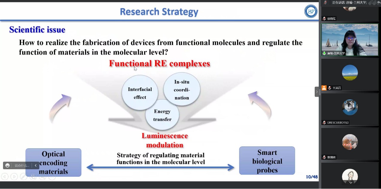 唐瑜教授介绍了她们课题组近年来在分子水平精准调控稀土配合物发光性能方面的研究进展,着重介绍了其团队通过界面效应、原位配位、能量转移与传递等策略,设计、合成具有特定结构与功能的有机配体,实现了稀土配合物的荧光光谱及寿命调制,并据此在多功能生物成像探针、多维度信息编码与存储、能源等领域做了一系列创新性工作,取得的研究成果对稀土功能配合物研究和稀土资源的高值化利用具有重要理论意义和应用价值。