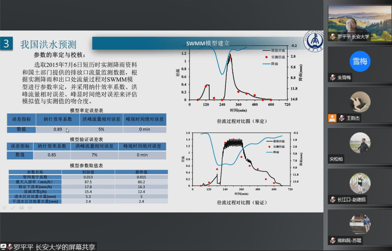 罗平平教授从碳达峰、碳中和的“双碳”背景出发,强调做好碳达峰、碳中和工作的重要性。阐述国内外洪水预测,国外洪水预测主要以越南顺化为例,模拟四种降雨模式下随时间变化的洪水深度和淹没面积。对于我国洪水预测,以SWMM模型为基础,展示LID径流的调控效果模拟;随后,对国内水文分析,主要包括了水文要素时空特征分析,区域水文要素之间存在复杂的相关性以及归一化植被指数具有明显的具体变化;简述国外森林水文情况。用王茂沟流域、秃尾河流域验证RRI模型,并分析验证结果;以改进的MCDRM模型进行人类活动干扰对灞河流域设计洪水的影响研究;展示不同设计标准暴雨洪水模拟计算结果对比图,分析了极端天气以及近代研究的古水文对流域流量的影响,对比了中日治水效果,讲座最后罗平平教授展示了他们团队的研究成果,实时监测设备“小禹”。