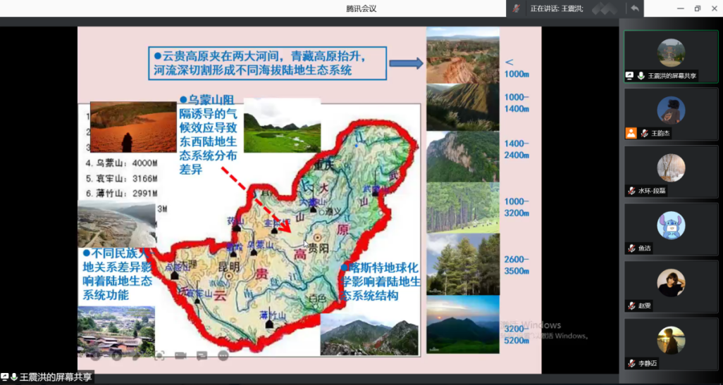 王震洪教授围绕研究的理论和应用意义、科学问题和研究内容以及未来值得聚焦的方向三个方面展开此次讲座。首先,详细阐述了陆地生态系统的概念、组成和功能,以及各生态系统之间相互影响和制约,通过阐述研究理论和应用意义,指出了流域存在的环境问题,明确建立健康水陆关系的重要性。其次,将核心问题:流域生态系统动力学及健康的水陆关系形成机理分解成四个关键科学问题并对其进行详细讲解。最后,王振洪教授提出未来可以从流域生态系统空间结构、过程及动力学机制与流域生态系统生物种类、分布格局、功能及耦合机制等方面入手开展进一步研究。