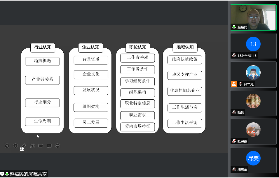 赵裕民按照研究生的特点和就业需求,围绕求职就业和外部职业世界展开讨论,首先解释了求职的本质是人职匹配,在求职过程中不仅要注重个人特质,还要结合当下与未来条件,根据长远目标、阶段目标和当下需求来选择职业。其次建议研究生要探索职业世界的层级,认识组织类型,了解企业文化与组织架构,打开视野,探索多个方向发展的可能性,同时需要关注地域、职位、行业、企业等方面的问题。最后赵裕民对研究生就业方面提出建议,研究生需正确看待就业,积极主动开展行动,充分利用人脉资源进而找到生涯密码。