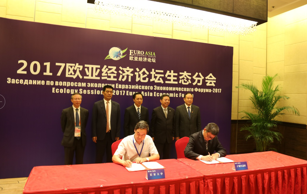 为促进欧亚国家环保合作交流,在环境保护部的指导下,中国-上海合作组织环境保护合作中心于2017年9月21-22日在中国西安举办了“2017欧亚经济论坛生态分会”,主题为“共建绿色丝绸之路,促进绿色城市发展”,旨在交流各国绿色城市发展政策、技术与实践,推动环保务实合作,服务绿色丝绸之路建设。我校副校长赵均海教授、科技处长韩玲教授、环境科学与工程学院院长钱会教授及环工学院相关教师受邀参会,并在9月21日下午的集中签约仪式上,与西安浐灞生态区管委会签署了战略合作协议。中国环境保护部国际合作司、陕西省人民政府、西安市人民政府等部门领导主持并见证了签约仪式。中国-上海合作组织环境保护合作中心副主任周国梅致辞,双方代表共30余人参加。赵均海副校长与浐灞生态区管委会樊伟副主任分别代表双方签订了协议。