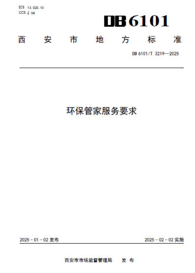 为贯彻落实《中华人民共和国环境保护法》等法律法规,以及《关于积极发挥环境保护作用促进供给侧结构性改革的指导意见》、《关于推进环境污染第三方治理的实施意见》等文件精神,培育及规范全市环保服务,促进环境服务业的发展,根据西安市市场监督管理局《关于征集2023年西安市地方标准制修订项目的通知》(西市监函发[2023] 6号)文件特编制《环保管家服务要求》。西安市市场监督管理局 2025年1月2日批准发布DB6101/T 3219-2025《环保管家服务要求》西安市地方标准,此标准于2025年2月2日开始实施;该标准由西安市环境保护科学研究院主编,我院白波、郭冀峰和叶林静三位老师参与了此次标准的编制。