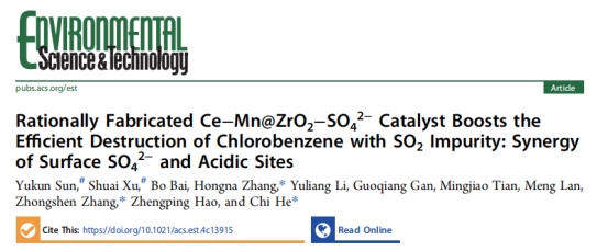 近日,我院化学工程与技术系教师孙钰琨、徐帅、白波教授与西安交通大学何炽教授联合在环境领域权威期刊《Environmental Science & Technology》(《环境科学与技术》,影响因子:10.80)上发表题为“Rationally Fabricated Ce-Mn@ZrO2-SO42- Catalyst Boosts the Efficient Destruction of Chlorobenzene with SO2 Impurity: Synergy of Surface SO42- and Acidic Sites”的研究论文(文章链接:https://pubs.acs.org/doi/10.1021/acs.est.4c13915?ref=PDF)。该文采用Ce-O-Mn活性位点体系,辅以ZrO2-SO42-保护层,构筑了一种新型Ce-Mn@ZrO2-SO42--微米管催化剂,其不仅对氯苯深度净化表现出优异的活性,而且对SO2和水蒸气表现出优异的抗性。同时,深入剖析活性氧与多种酸位点的协同作用,是催化降解工业含氯可挥发性有机化合物的又一重大进展。