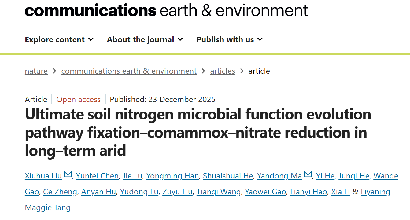 12月23日,我校水环学院刘秀花教授团队在Nature子刊《地球与环境通讯》(Communications Earth & Environment)发表题为“Ultimate soil nitrogen microbial function evolution pathway fixation–comammox–nitrate reduction in long–term arid” 的最新研究成果。该成果首次证明:在长期干旱压力下,土壤微生物群落为适应氮素限制演化出一条独特的终极功能路径:固氮-完全氨氧化-硝酸盐还原循环。yl8cc永利线路检测中心黄土科学国家重点实验室为论文第一完成单位,刘秀花教授与陕西省林科院马延东副研究员为共同通讯作者。合作者包括中科院地环所韩永明研究员、澳大利亚纽卡斯尔大学Maggie Tang副教授等。