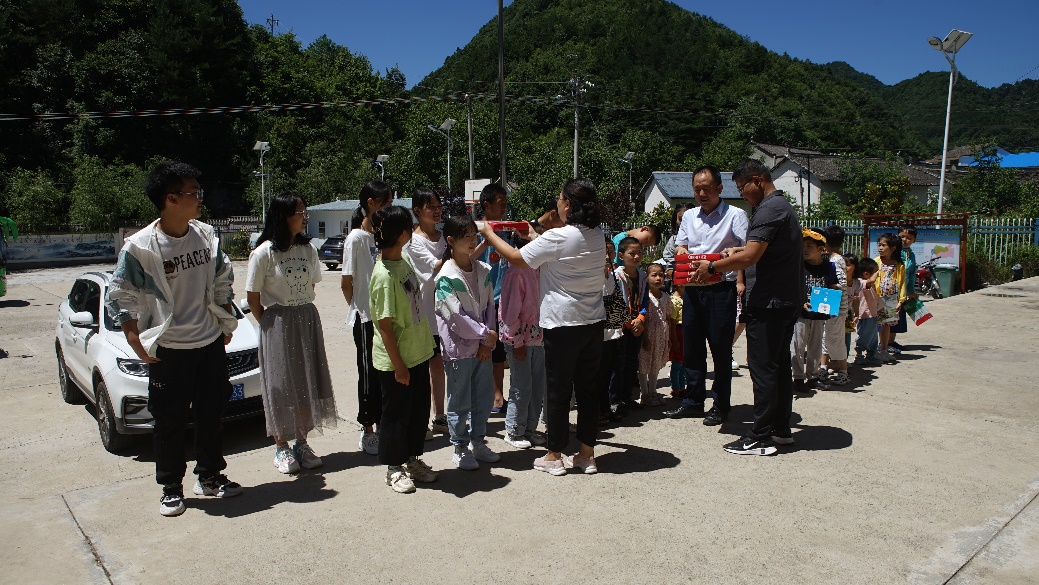 图1 白波院长和马明芳副书记为核桃坪村留守儿童增送礼物