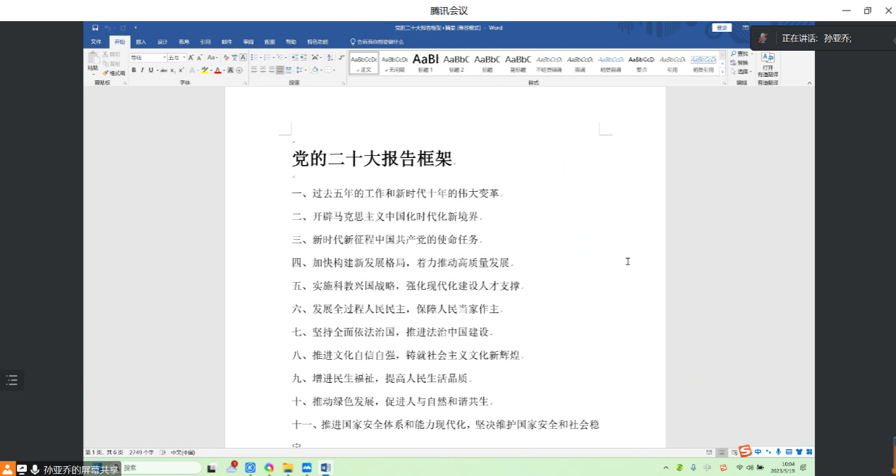 孙亚乔从党的二十大报告框架为线索,从三个务必,十年来三件大事,中国共产党的中心任务,中国式现代化的本质要求,牢牢把握五个重大原则,全面建设社会主义现代化国家的首要任务,全面建设社会主义现代化国家的基础性、战略性支撑,全面建设社会主义现代化国家必须坚持中国特色社会主义文化发展道路,全面建设社会主义现代化国家的战略要求,“五个必由之路”等多维度全方面的介绍了党的二十大精神精髓。随后,孙亚乔要求大家严格按照支部理论学习计划和要求,保质保量地完成学习内容。