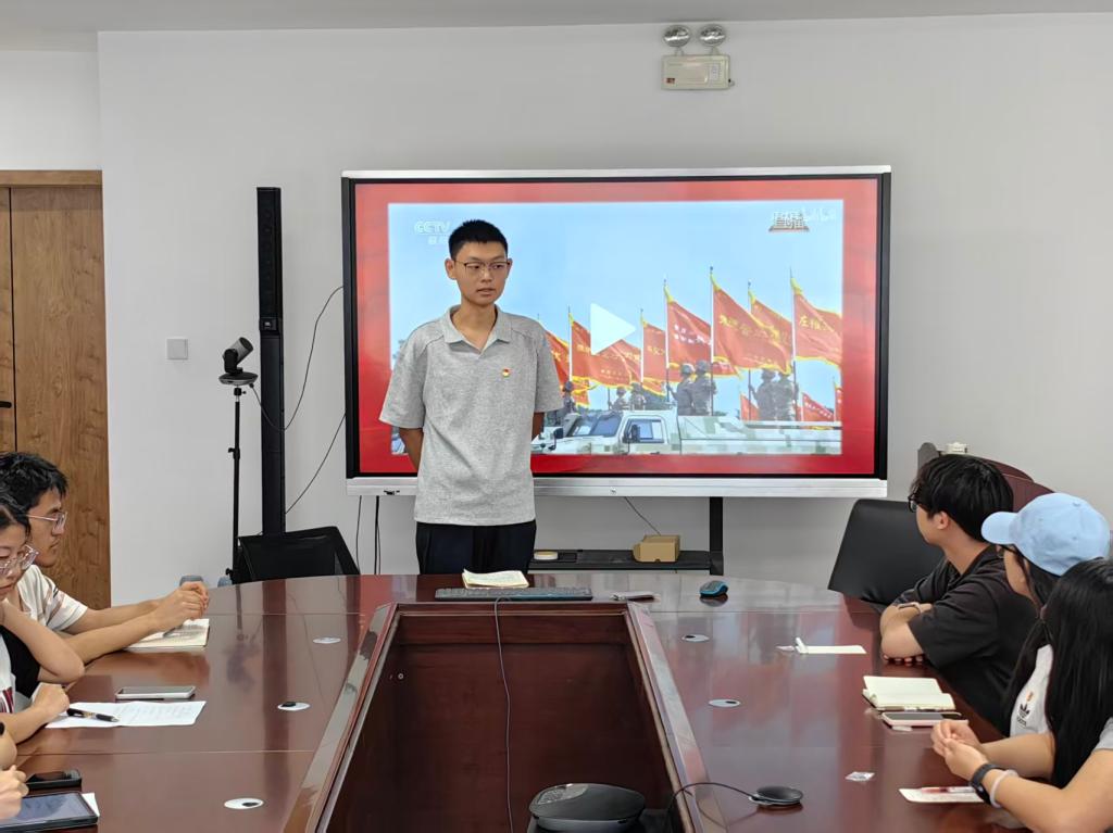 学生党员王家程为支部党员同志以“九三阅兵”战旗方队为引入,讲述“狼牙山五壮士”的英勇事迹。号召支部党员同志学习五位革命先辈心怀家国、顾全大局、不畏艰难、敢于斗争的伟大精神。随后,支部党员开展交流研讨,并重温入党誓词。