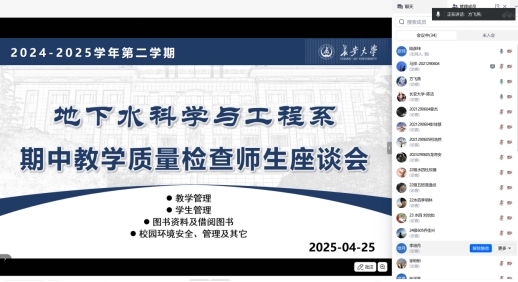 为进一步提升教学质量,深入了解学生在学习与生活中的实际需求,yl8cc永利官网地下水科学与工程系于4月25日通过线上会议形式召开了2024-2025学年第二学期期中教学质量检查师生座谈会。学院副院长李培月、地下水系主任陈洁、地下水系教师代表及本科四个年级的学生代表共计30余人参加本次会议。会议由地下水系副主任陆彦玮主持。