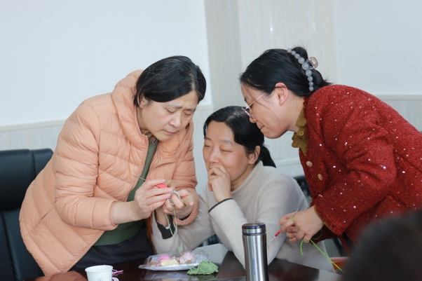 女教师们围坐一堂,全神贯注地投入创作。平日里严谨细致的教师们,此刻化身“巧手绣娘”,指尖彩线翻飞,笑语此起彼伏。还有几位老师主动担任“助教”,互相分享编织心得。短短两小时,一朵朵栩栩如生的绒线花在指尖绽放,精巧的挂件承载着欢声笑语,更凝聚着对生活的热爱。